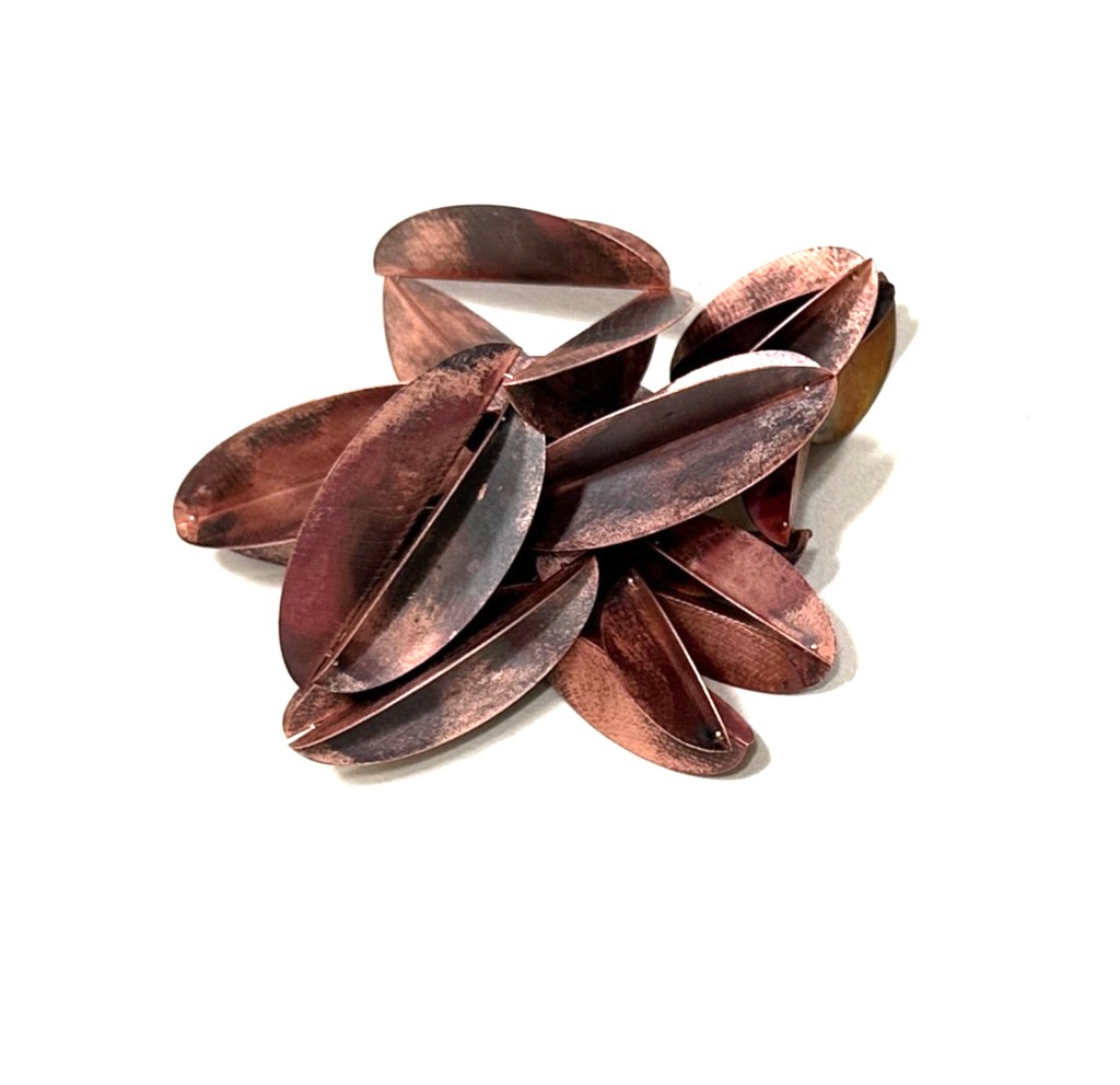 Saskia has an enduring fascination with seeds and pods, which is evident in much of her work. She tends to play with multiples of shapes or forms that catch her attention, perhaps linking them, or assembling them to make larger solids.