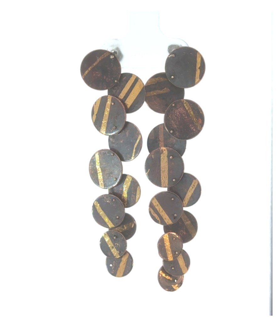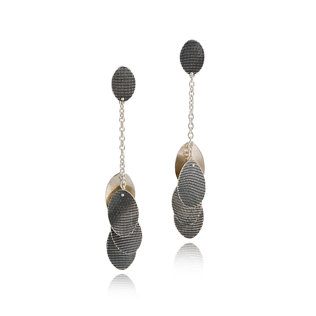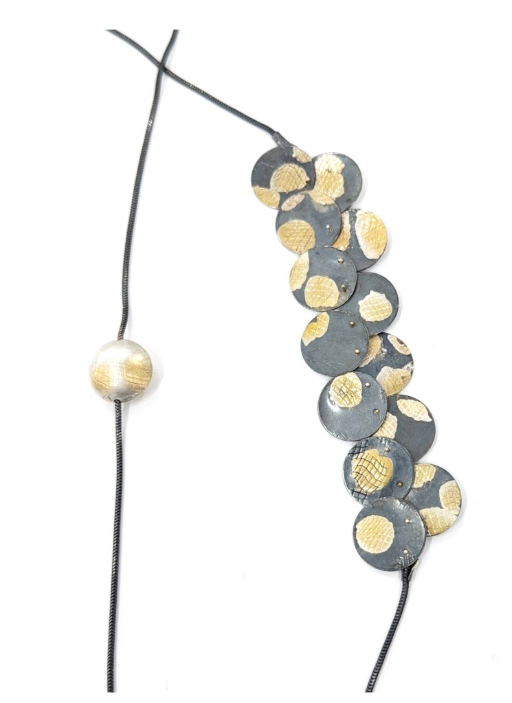 She uses metal often, and sometimes other materials. This year she has been exploring different combinations of metals and other materials. Generally she prefers the limited range of colours of the metals themselves, developing texture to make patterns and contrast.